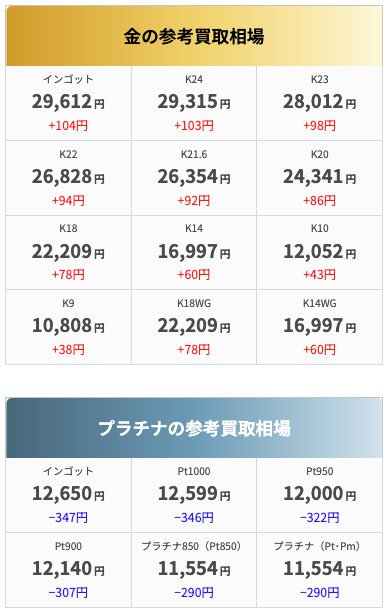 多くの買取業者では公式サイトでその日の買取価格を公開しているため、参考にしてみてください。